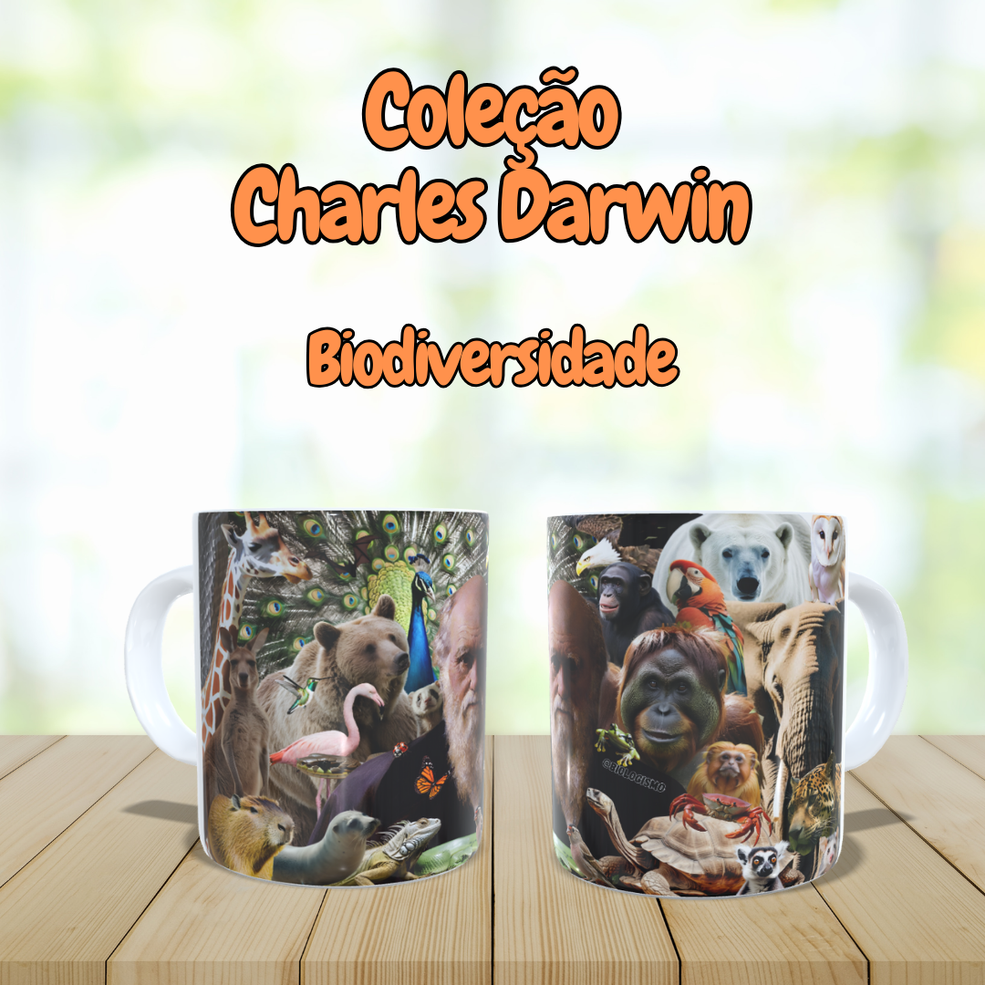 Caneca branca de cerâmica ilustrando o pai da Evolução, Charles Darwin e diversos animais de todo o globo.