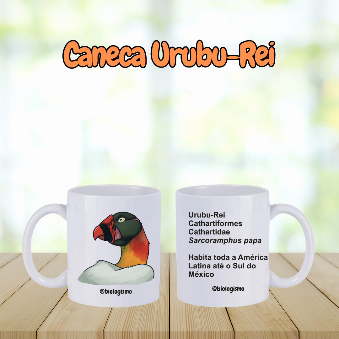 Caneca branca de cerâmica com a ilustração do mascote da Biologismo, o Urubu-Rei e informações sobre a espécie.