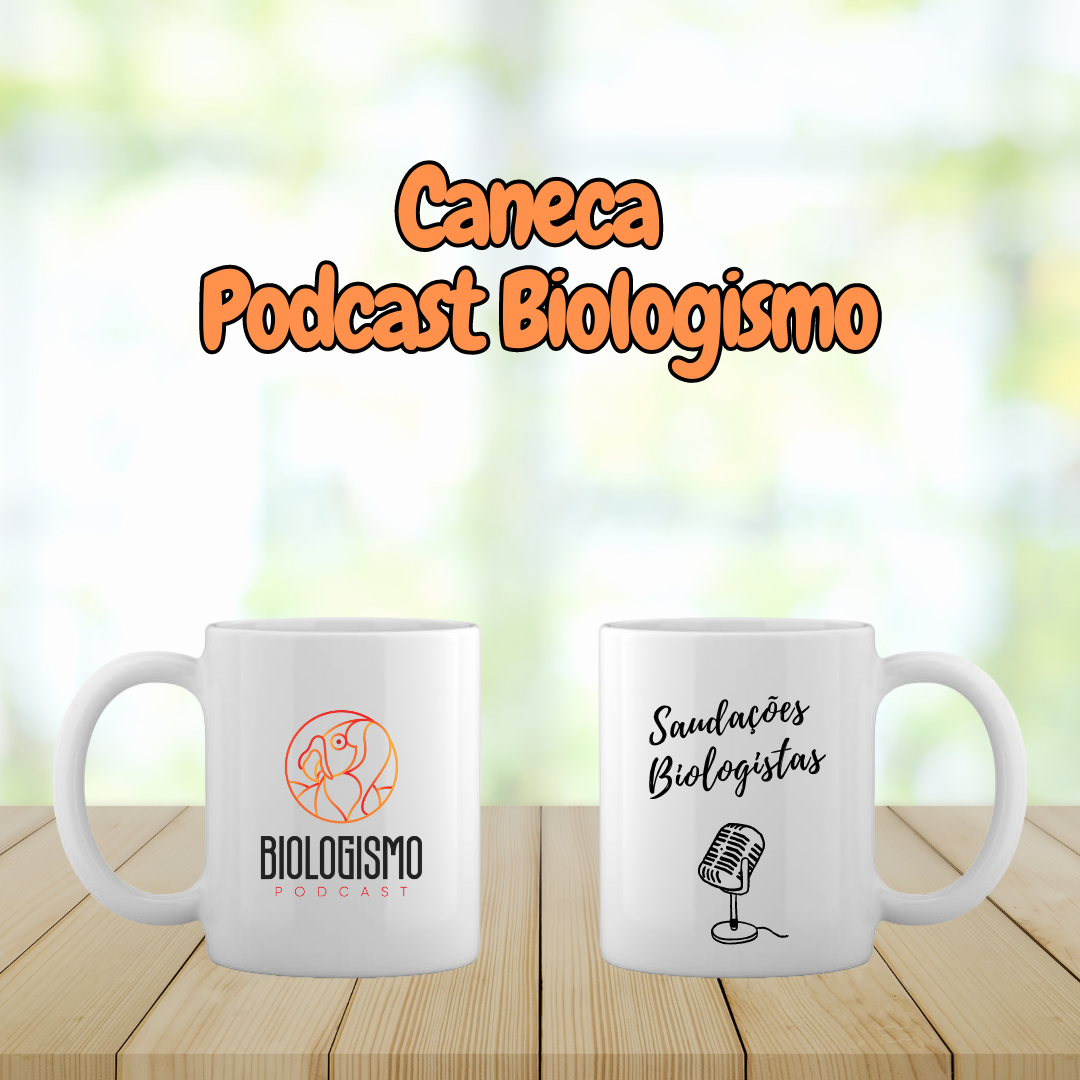 Caneca branca de cerâmica com o logotipo e o bordão do Podcast Biologismo.